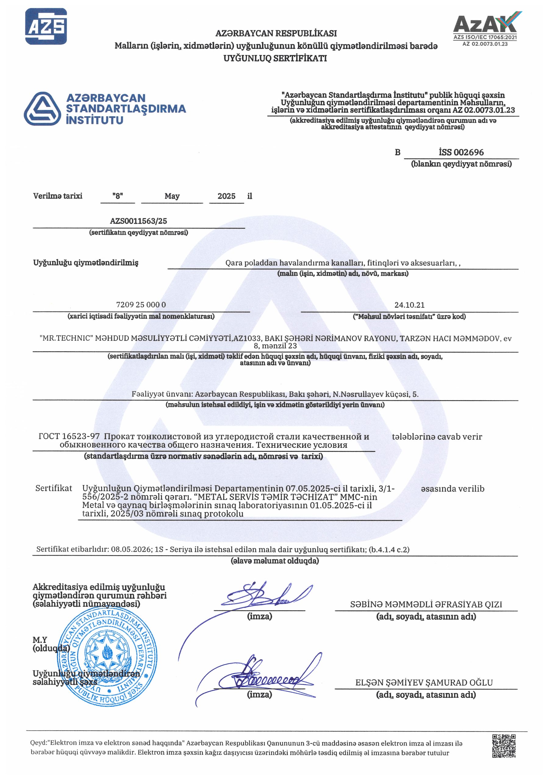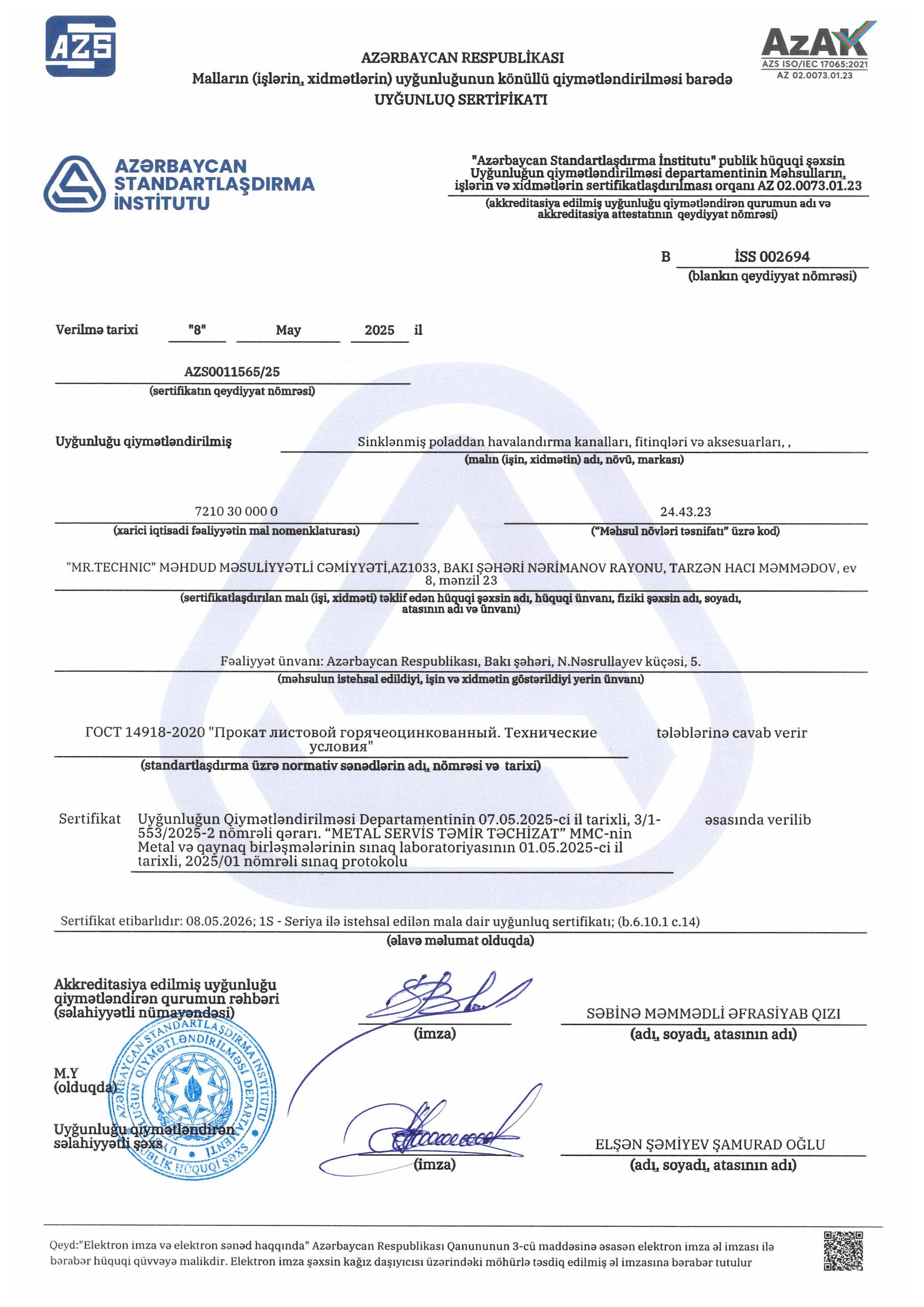 Bütün texniki həllər müasir standartlara uyğun şəkildə layihələndirilir və yalnız keyfiyyətli, sertifikatlı materiallardan istifadə olunaraq icra edilir.